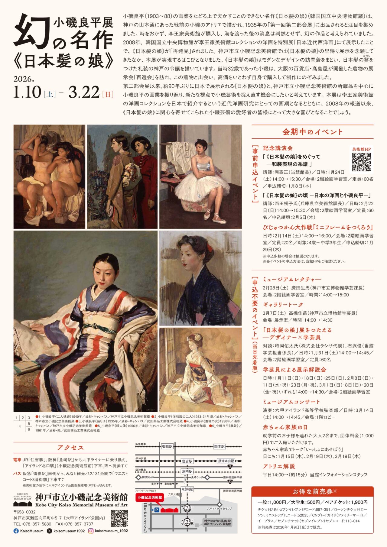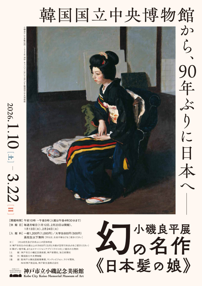 神戸市立小磯記念美術館では、特別展「小磯良平展――幻の名作《日本髪の娘》」を2026年1月10日(土曜)~3月22日(日曜)の会期で開催します。日本を代表する洋画家・小磯良平(1903~88)は、人物画とりわけ気品と静謐さに満ちた女性像で多くの方に愛されてきました。小磯の画業をたどる上で欠かすことのできない名作が《日本髪の娘》(韓国国立中央博物館蔵)です。この作品は神戸の山本通にあった戦前の小磯のアトリエで描かれ、1935年の「第一回第二部会展」に出品され、注目を集めました。時をおかず、李王家美術館が購入し、海を渡ったところまではわかっていましたが、その後の消息は判然とせず、幻の作品と考えられていました。