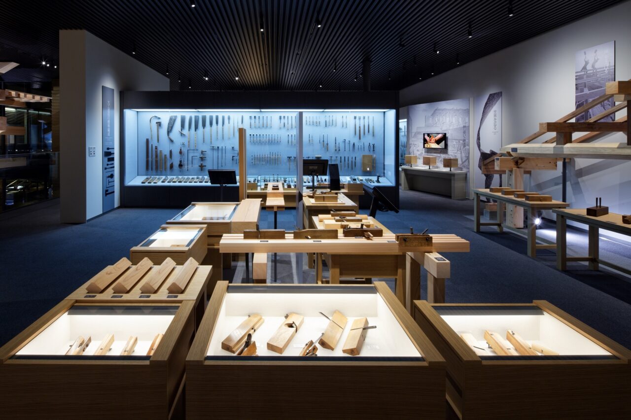 これまで収集した3万5千点余りの中から選りすぐった約1千点の大工道具のほか、吹き抜け空間に7メートルを超える高さでそびえたつ原寸大の唐招提寺金堂の柱と組み物、数寄屋の繊細な仕事が見えるスケルトン茶室など、現代の匠たちの手によって最高の職人技を詰め込んだ特別な模型を展示しています。